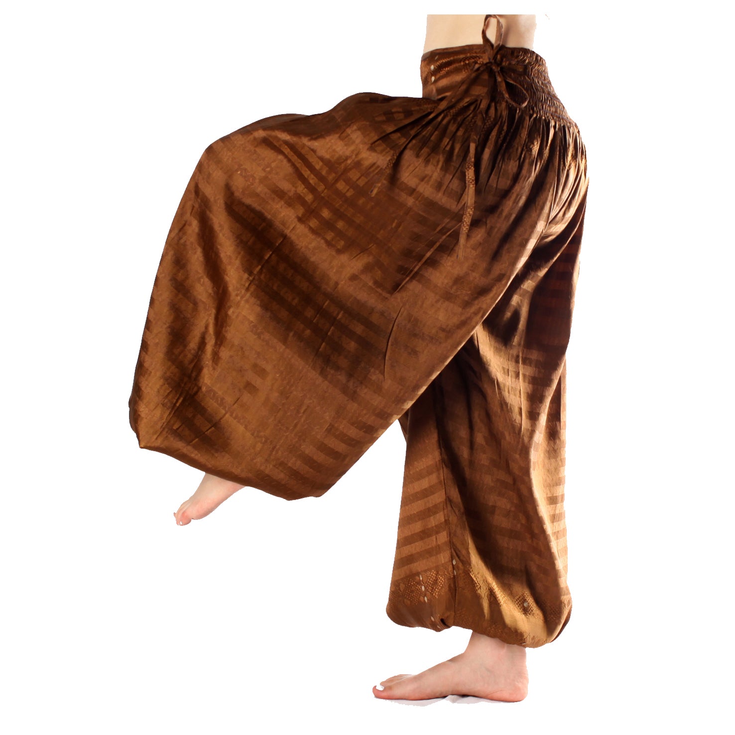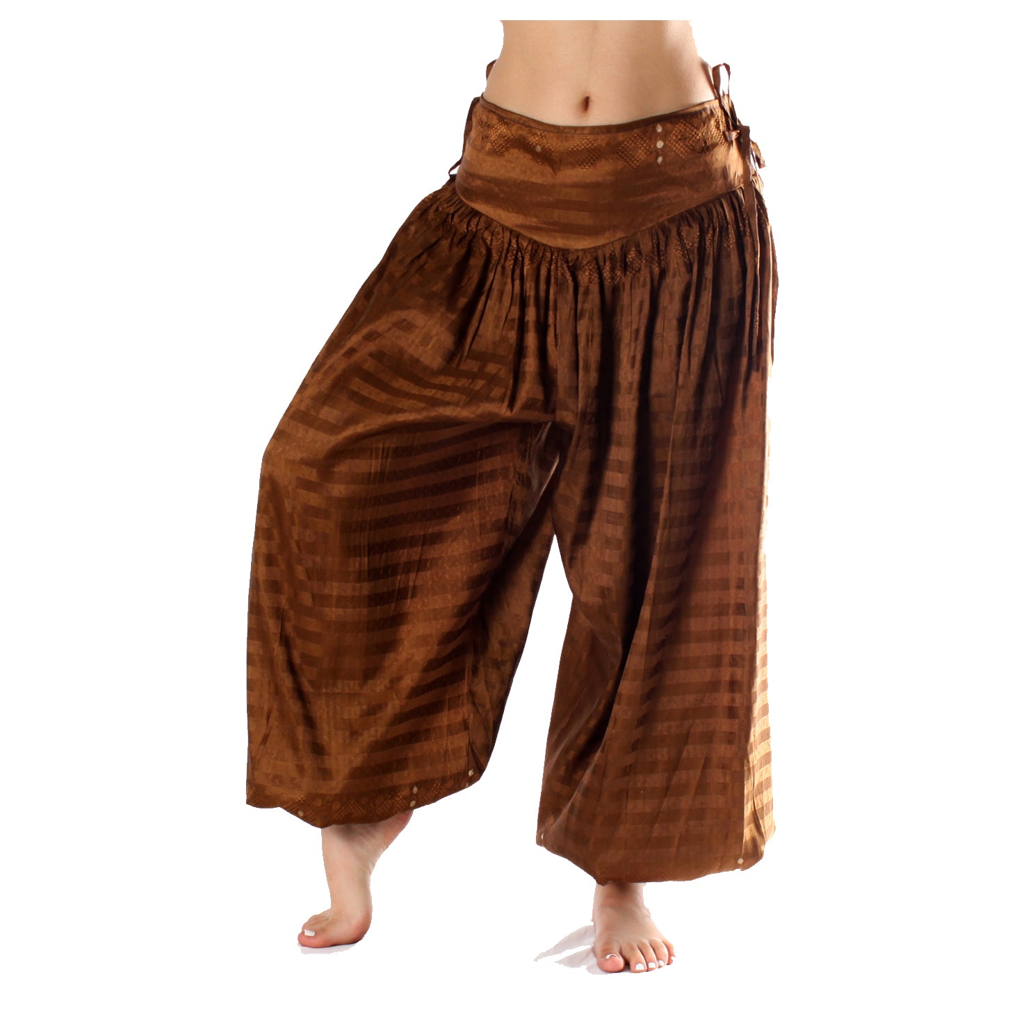 Pantalón tipo harem de pierna ancha, confeccionado a partir de saris brocados de seda reciclados de la India, perfectos para un look ecléctico con matices étnicos, alternativos o tribales. Ideal también como vestuario para danza fusión, Tribal o FCBD® Style.