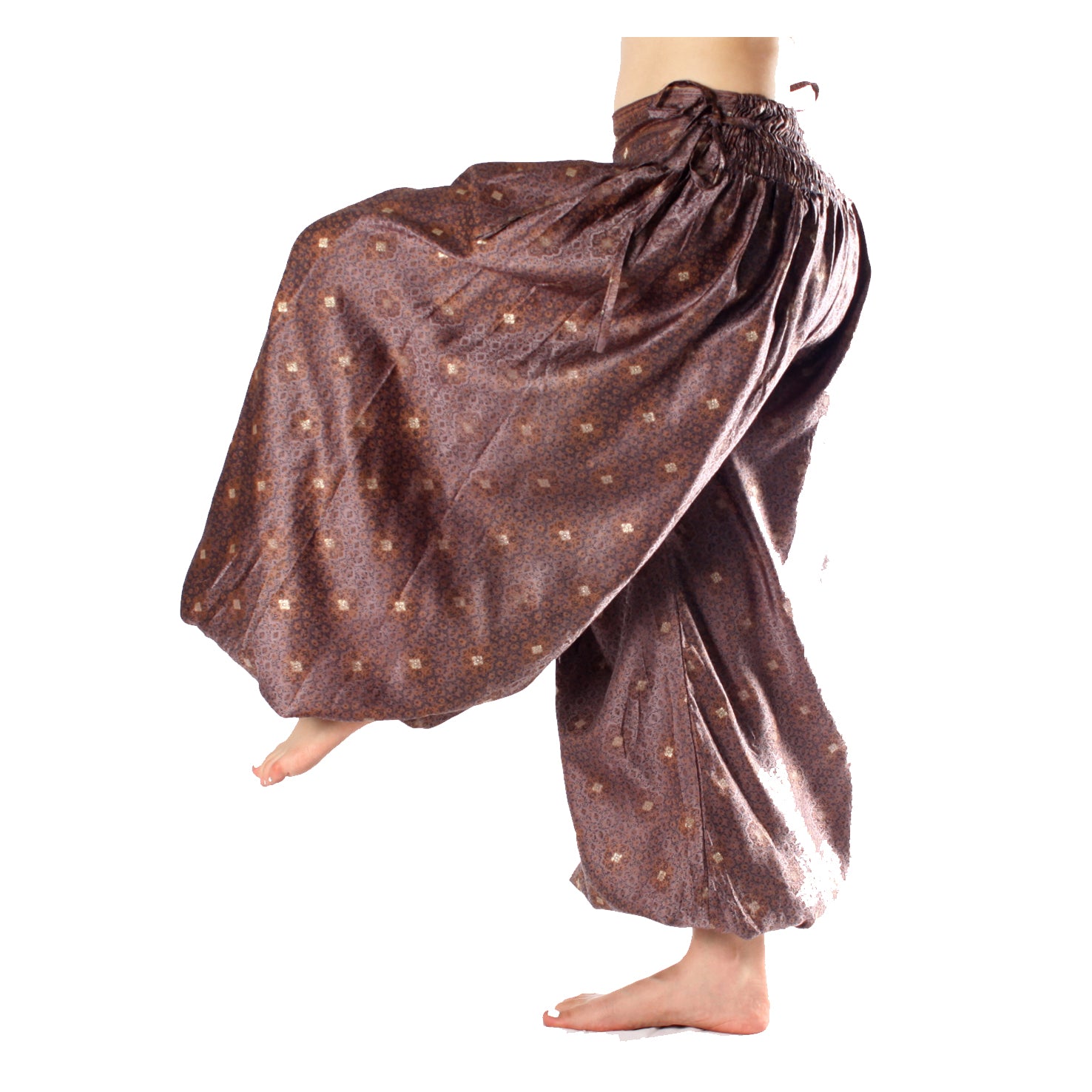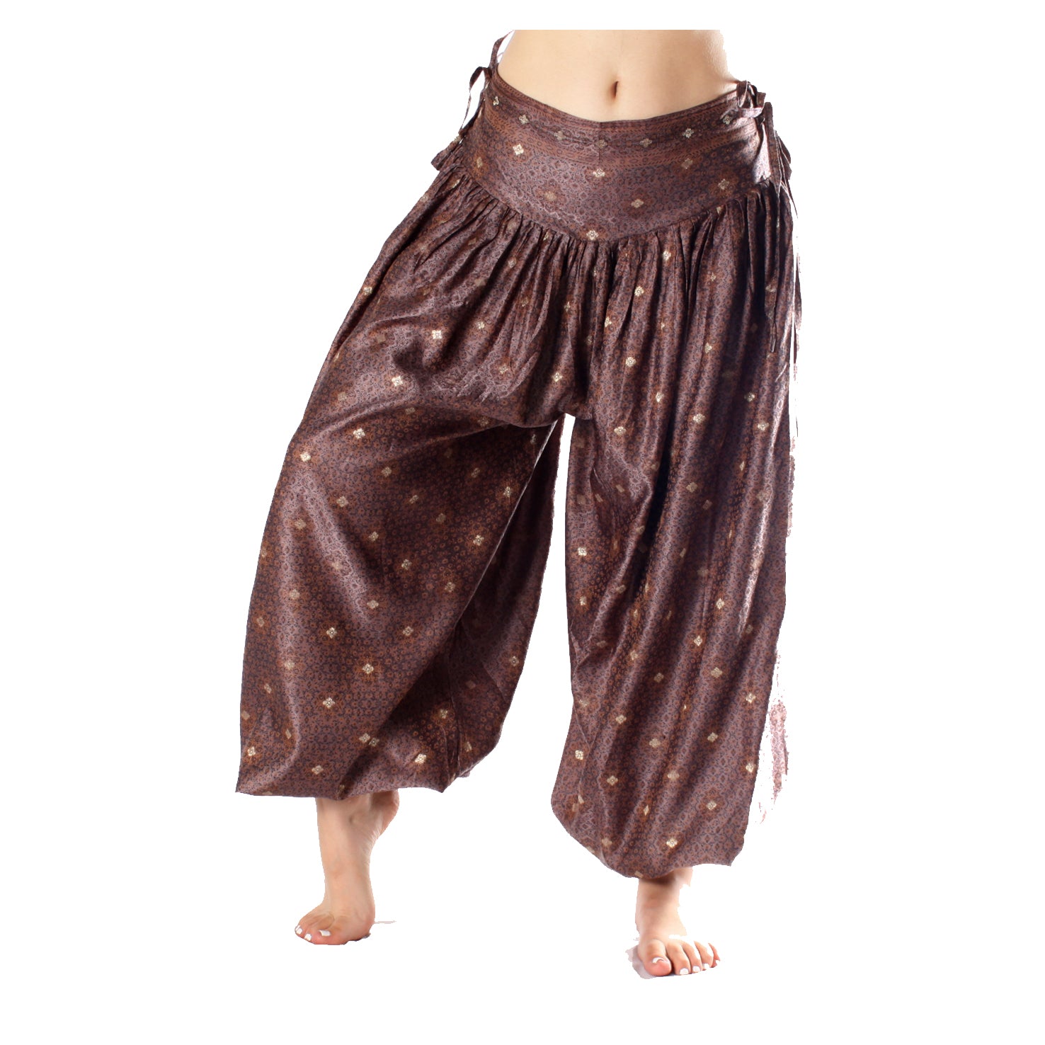 Pantalón tipo harem de pierna ancha, confeccionado a partir de saris brocados de seda reciclados de la India, perfectos para un look ecléctico con matices étnicos, alternativos o tribales. Ideal también como vestuario para danza fusión, Tribal o FCBD® Style.