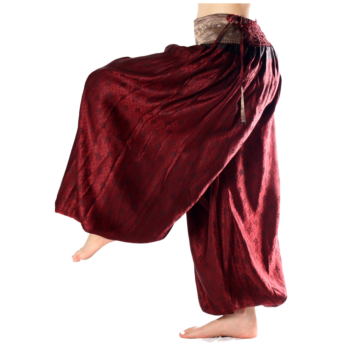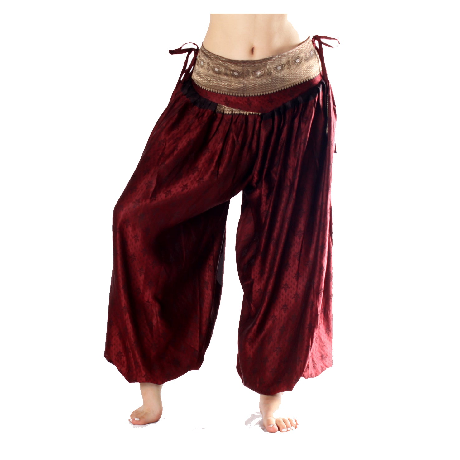 Pantalón tipo harem de pierna ancha, confeccionado a partir de saris brocados de seda reciclados de la India, perfectos para un look ecléctico con matices étnicos, alternativos o tribales. Ideal también como vestuario para danza fusión, Tribal o FCBD® Style.
