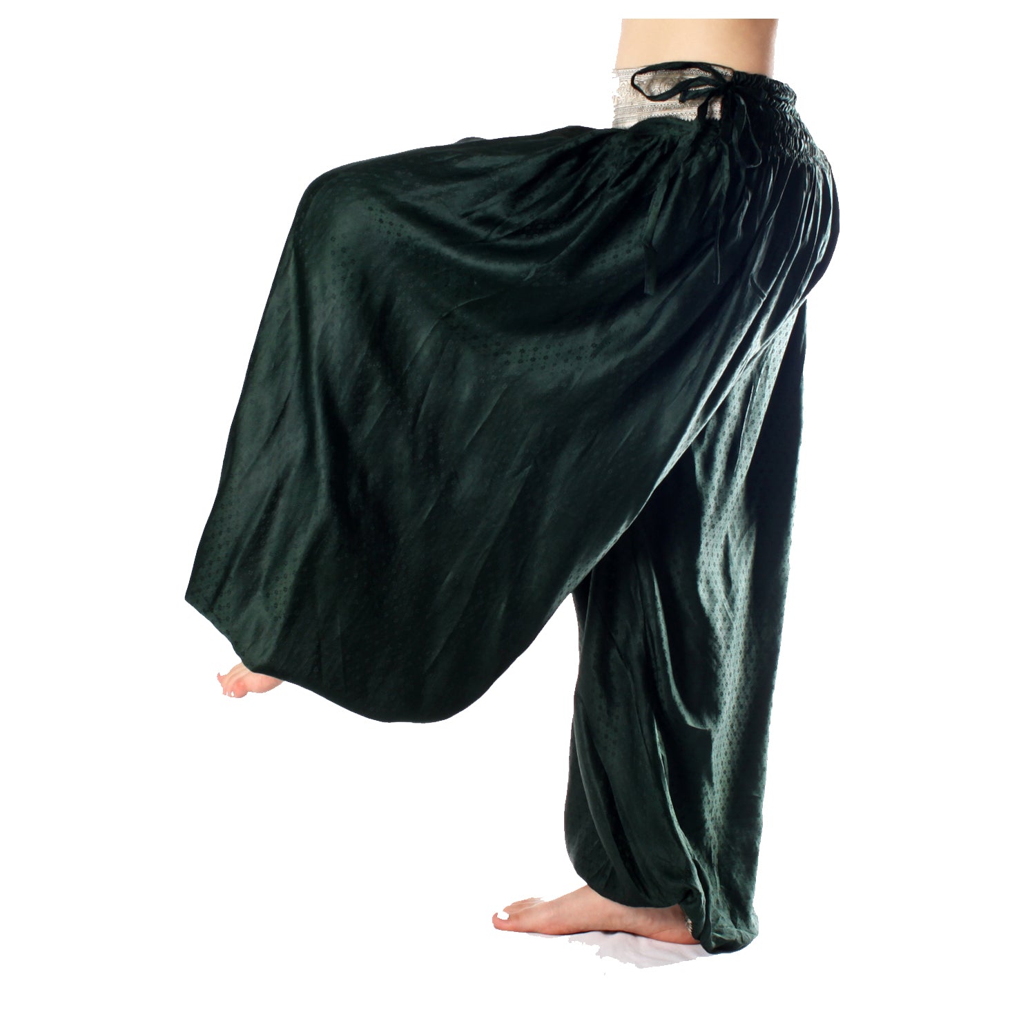 Pantalón tipo harem de pierna ancha, confeccionado a partir de saris brocados de seda reciclados de la India, perfectos para un look ecléctico con matices étnicos, alternativos o tribales. Ideal también como vestuario para danza fusión, Tribal o FCBD® Style.