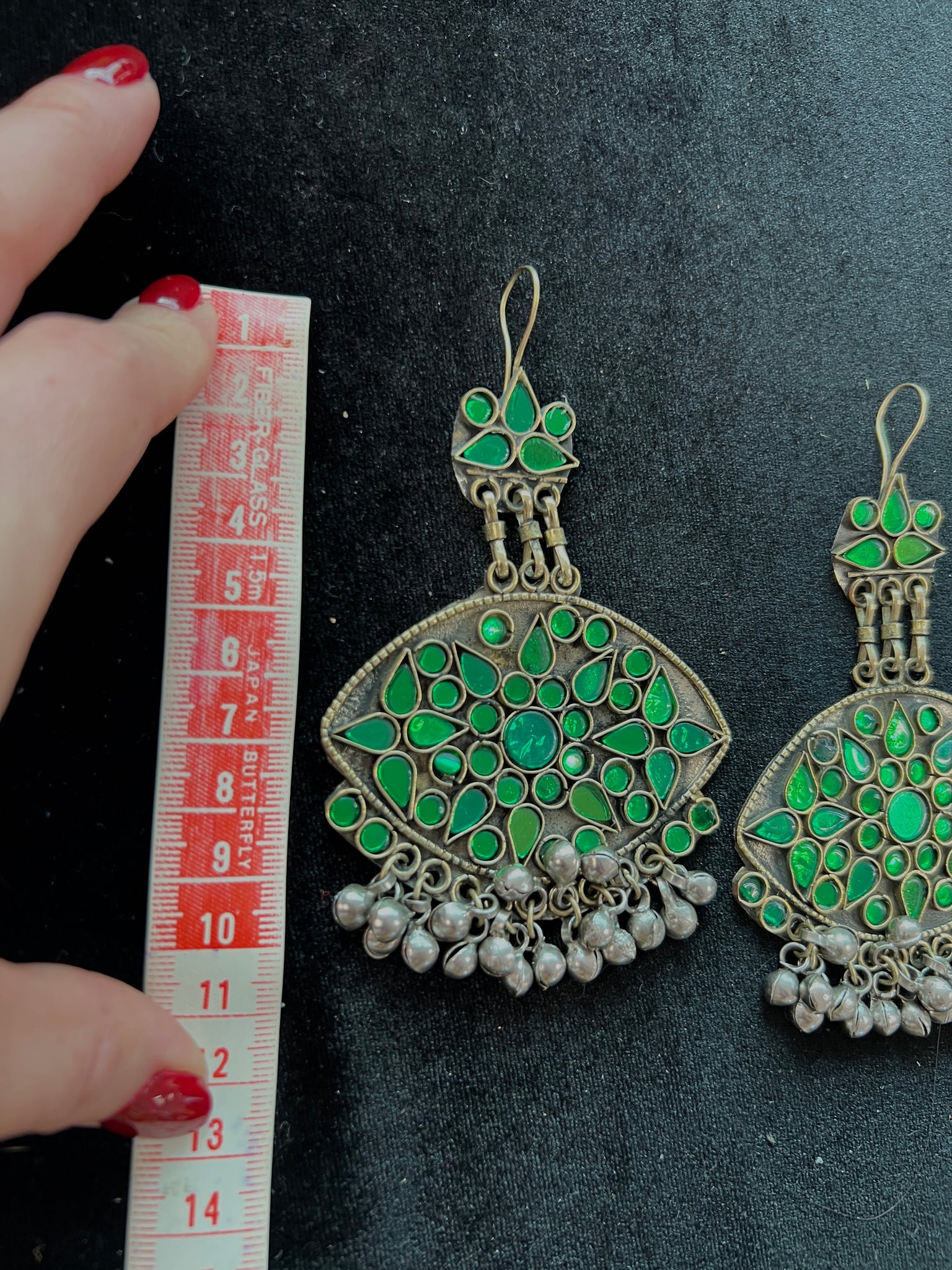 Aretes artesanales de estilo tribal elaborados en aleación de metal con incrustaciones en tono verde intenso. Diseño calado con detalles colgantes que aportan movimiento y sonido sutil. Llamativos y ligeros, ideales para danza, festivales o para dar un acento bohemio y elegante a cualquier look.